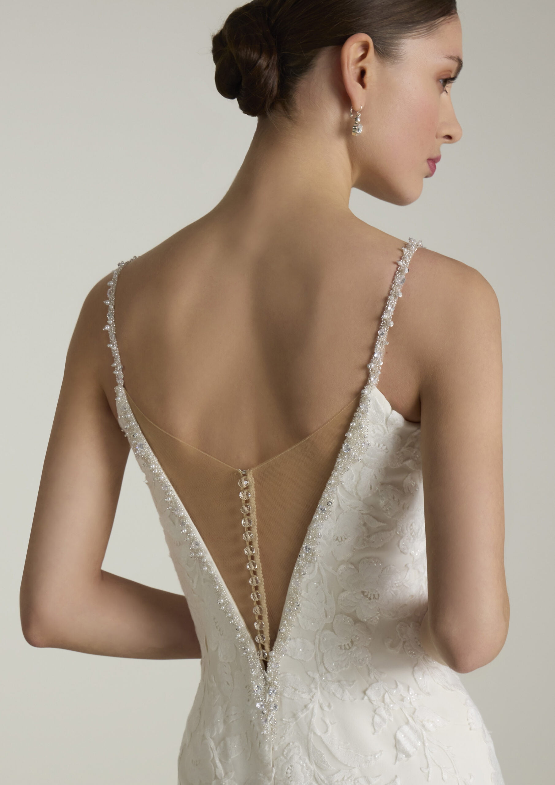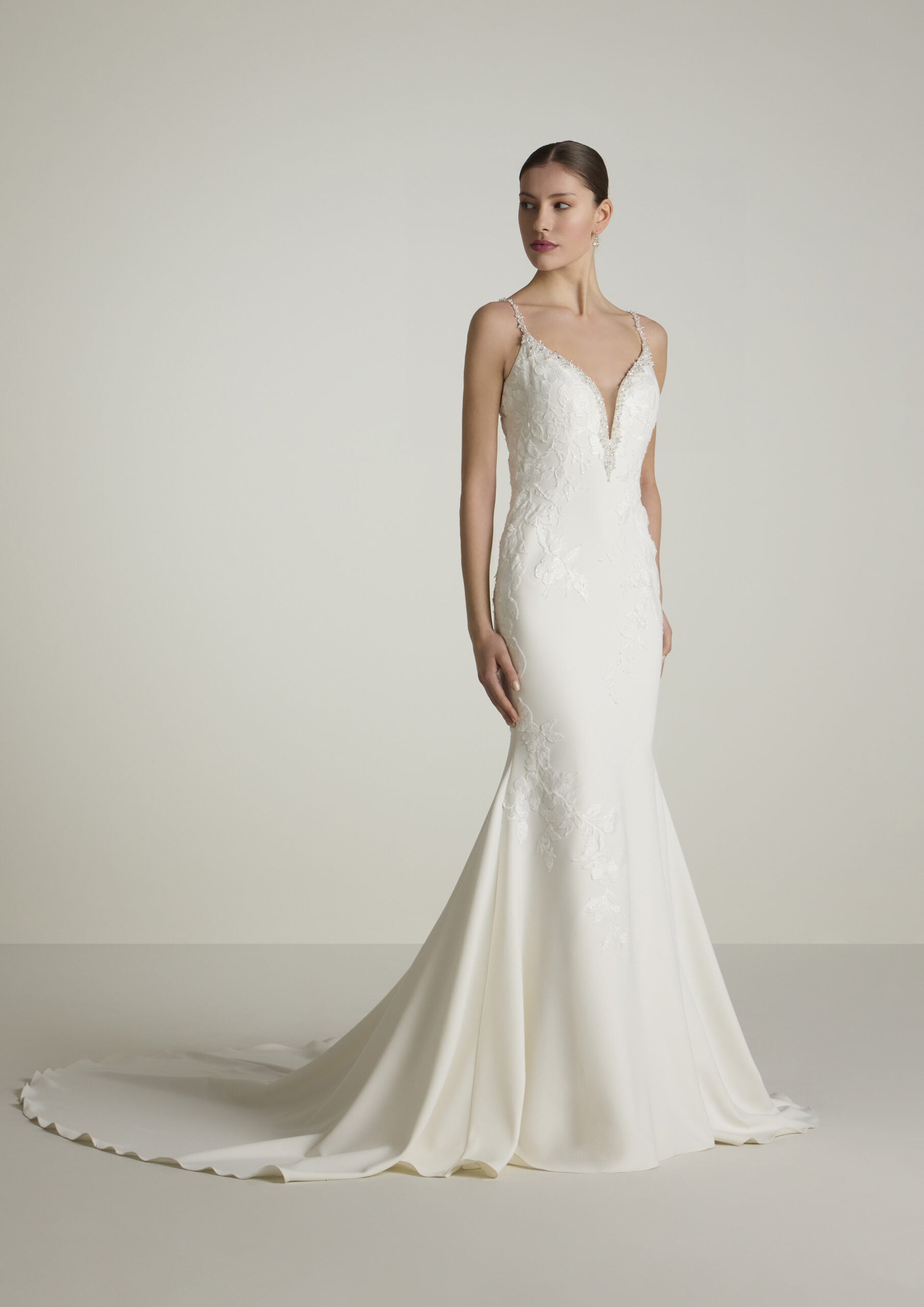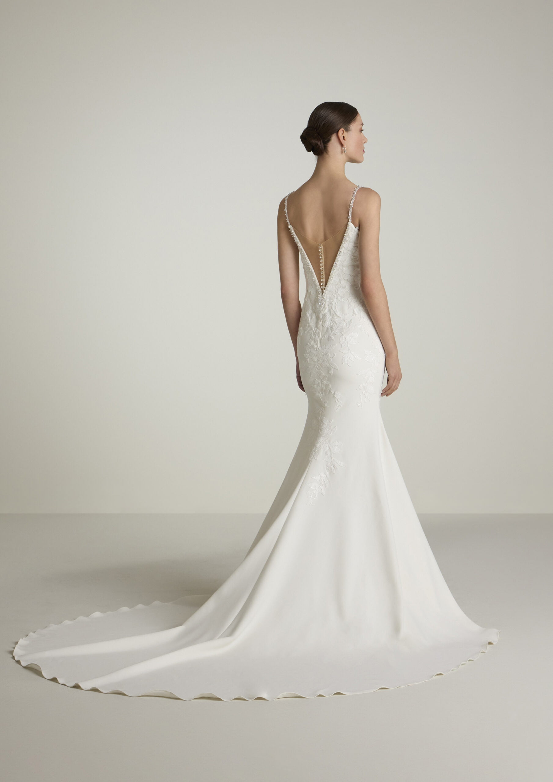 Elegante zeemeermin japon van crepe met een diepe V-hals afgewerkt met een strassrand, spaghettibandjes en een lage V-rugpand.