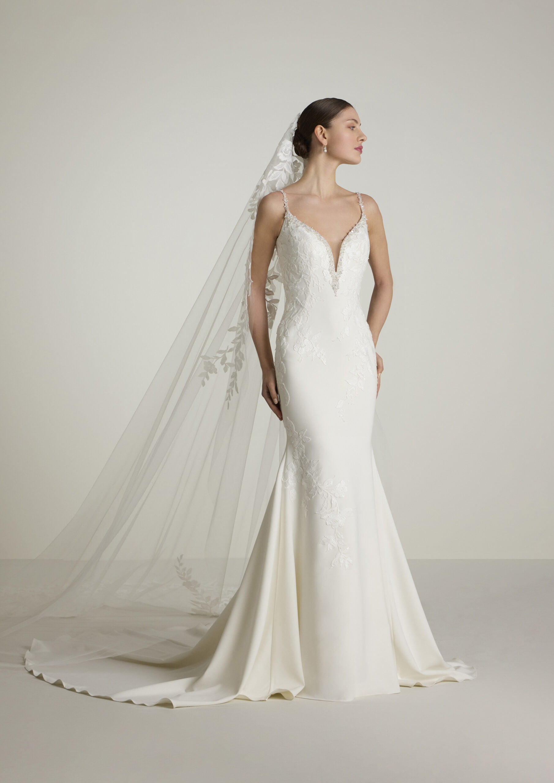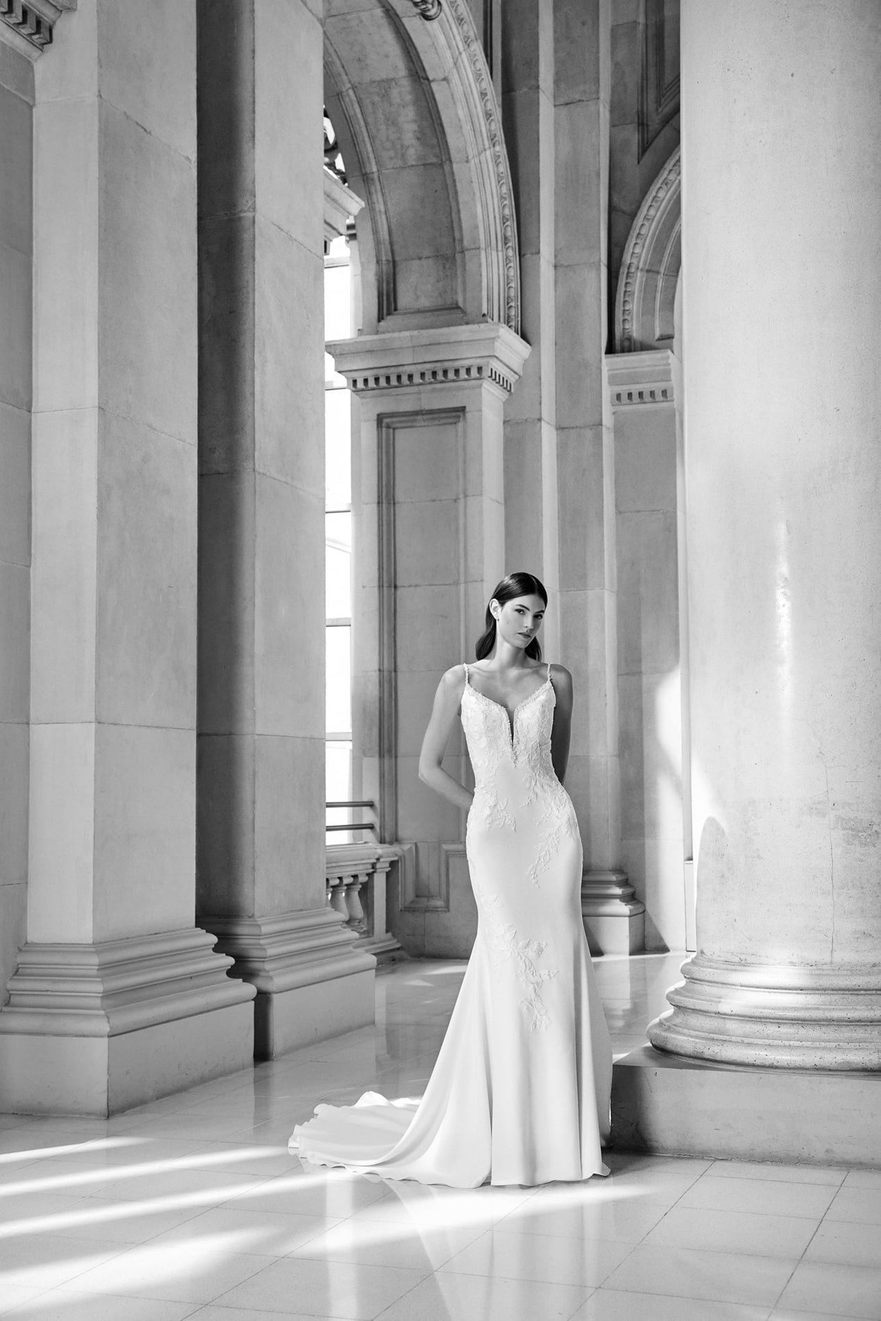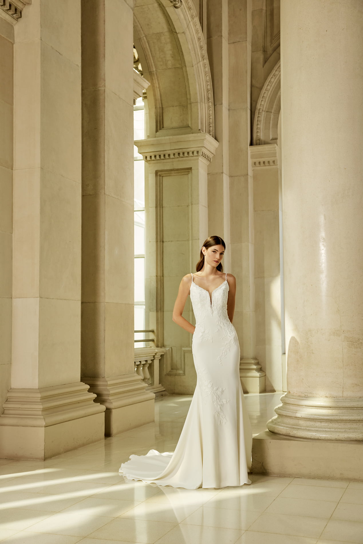 Elegante zeemeermin japon van crepe met een diepe V-hals afgewerkt met een strassrand, spaghettibandjes en een lage V-rugpand.
